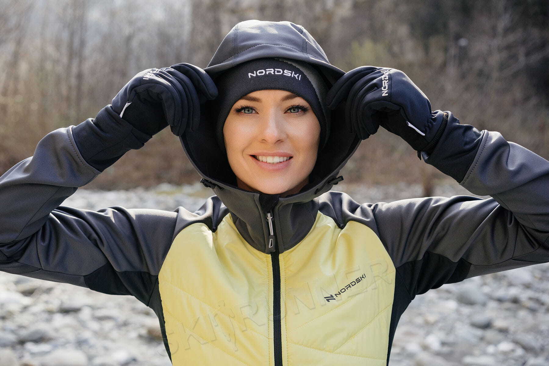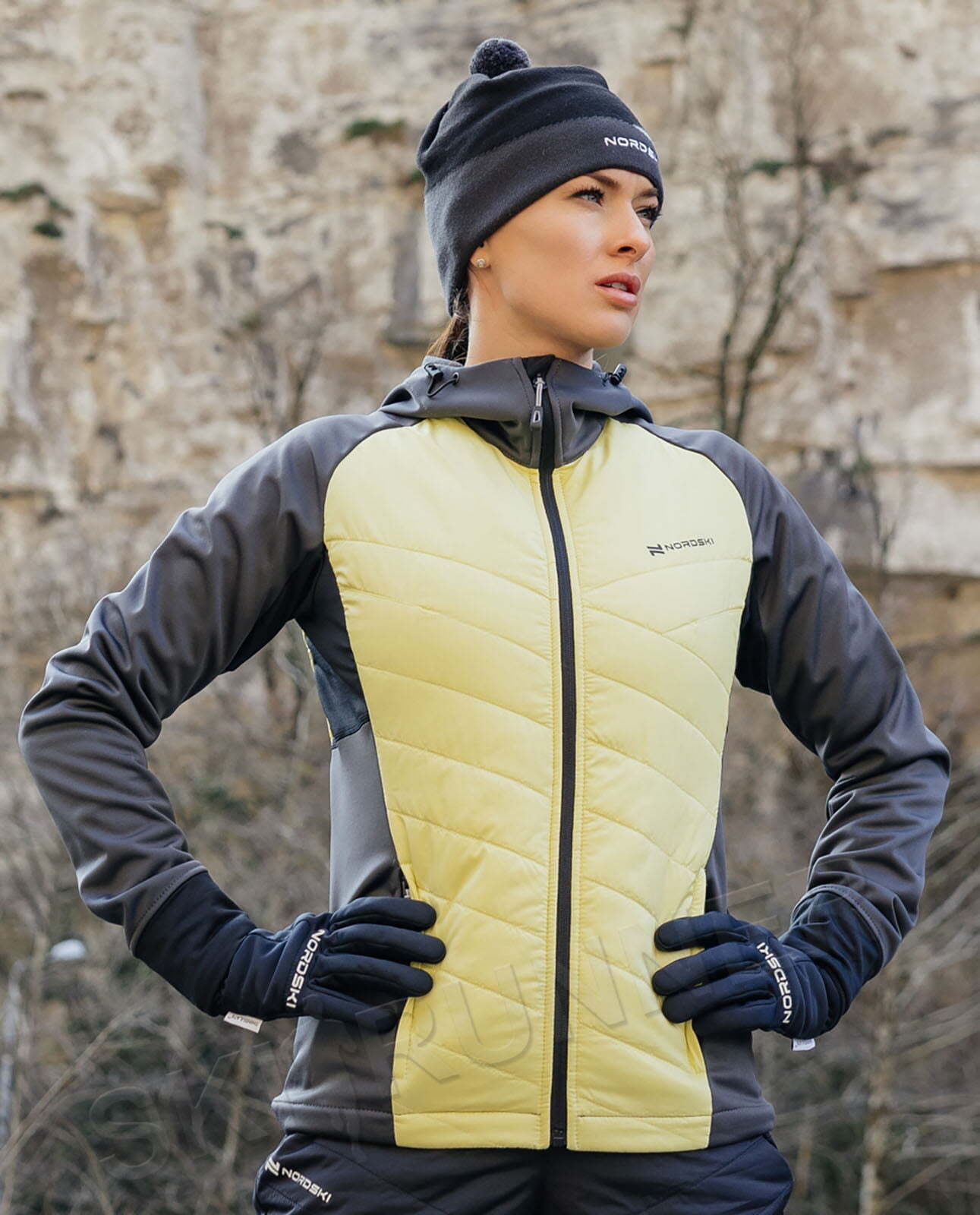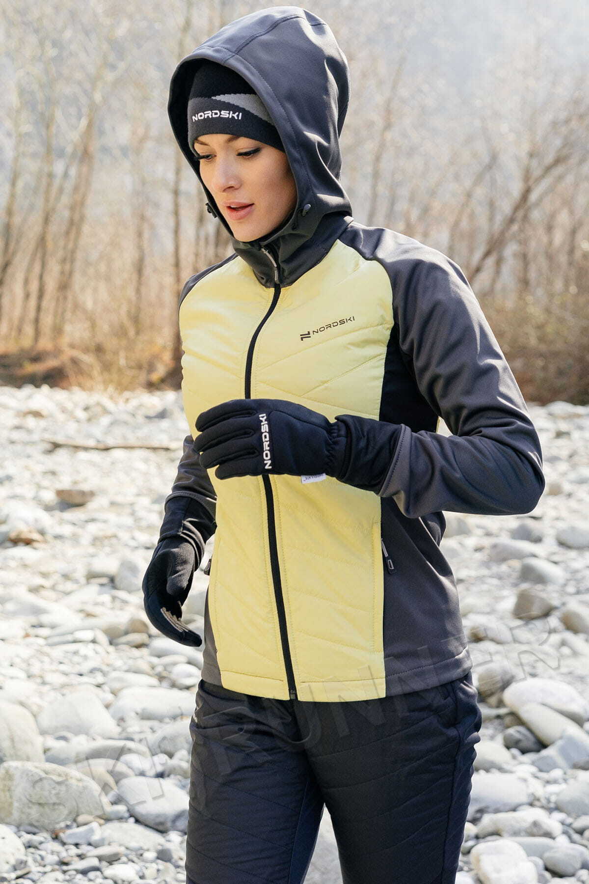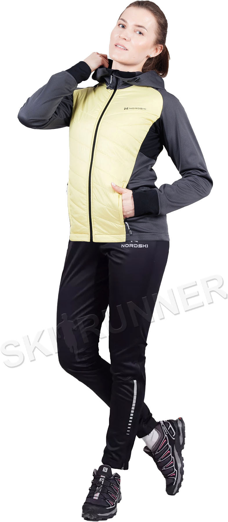 Премиальный костюм для лыж и зимнего бега Nordski Hybrid Hood Premium Black/Yellow женский с лямками предназначен для: