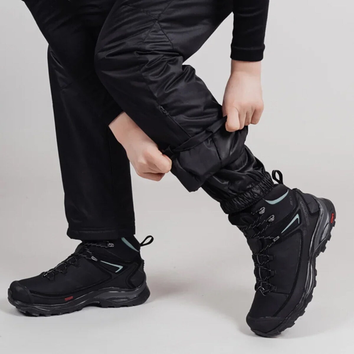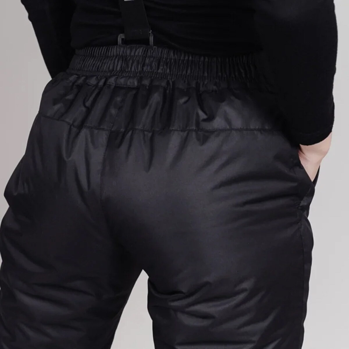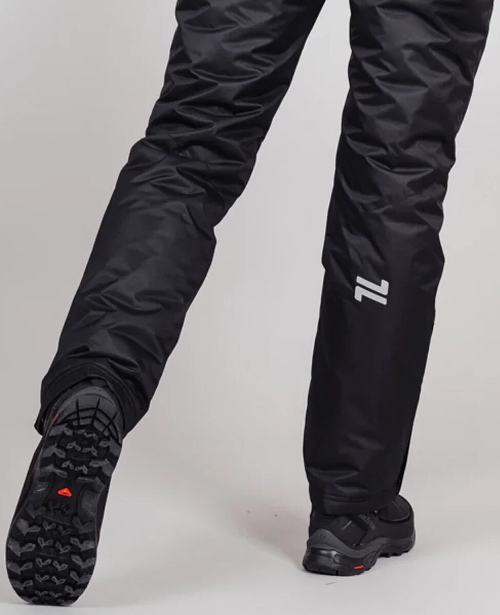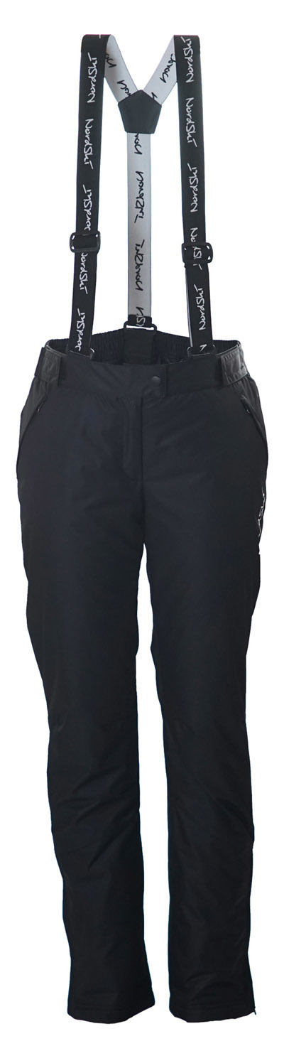 Брюки женского фасона, прямого классического кроя с отстегивающейся регулируемыми бретелями. В поясе модель дополнена застежкой на клепке и молнией. Карманы на бедрах с закрытыми молниями. Посадка на талии регулируется липучками. Боковые молнии в нижней части брюк для удобства надевания ботинок. Снегозащитные гетры с прорезиненной антискользящей полосой.