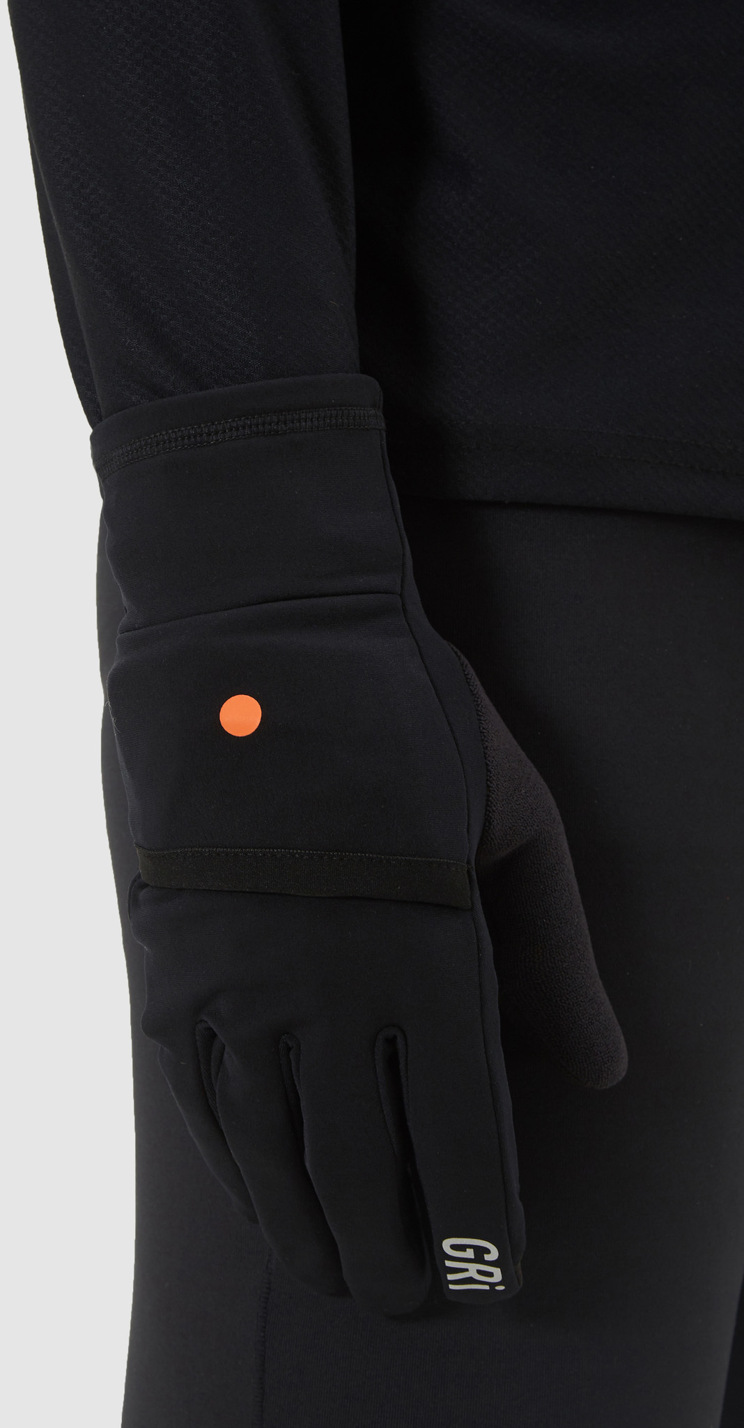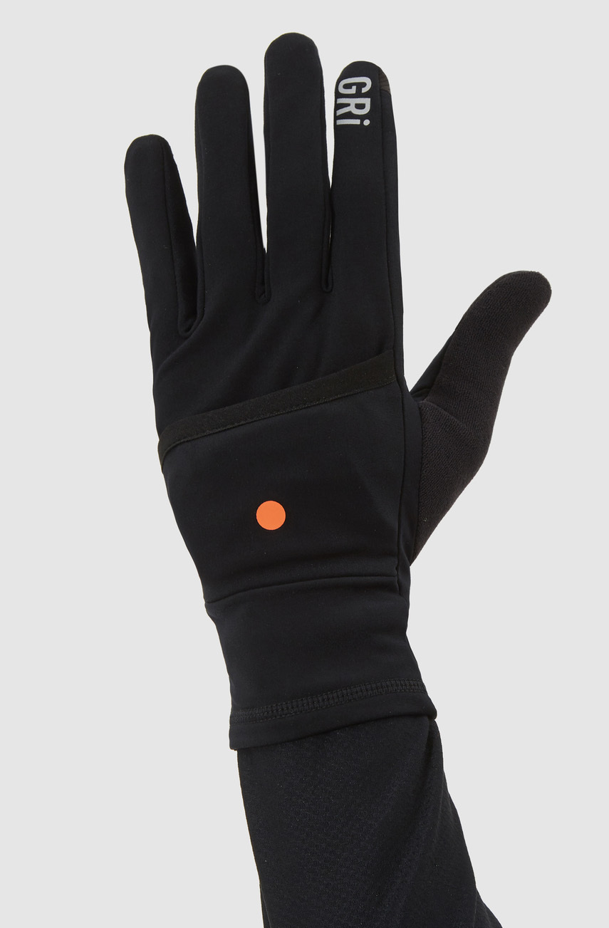 Перчатки Комби — важнейший аксессуар для пробежек зимой. Первые беговые перчатки GRI выполнены из эластичного трикотажа с микрофлисом. На внутренней стороне оборудован клапан с ветрозащитной мембраной, который можно убрать в специальный кармашек. На ладонях — силиконовое напыление, на большом и указательном пальцах — тачскрин накладки. Перчатки удобно хранить благодаря магнитному креплению. Светоотражающие логотипы сделают ваши тренировки безопасными в темное время суток.