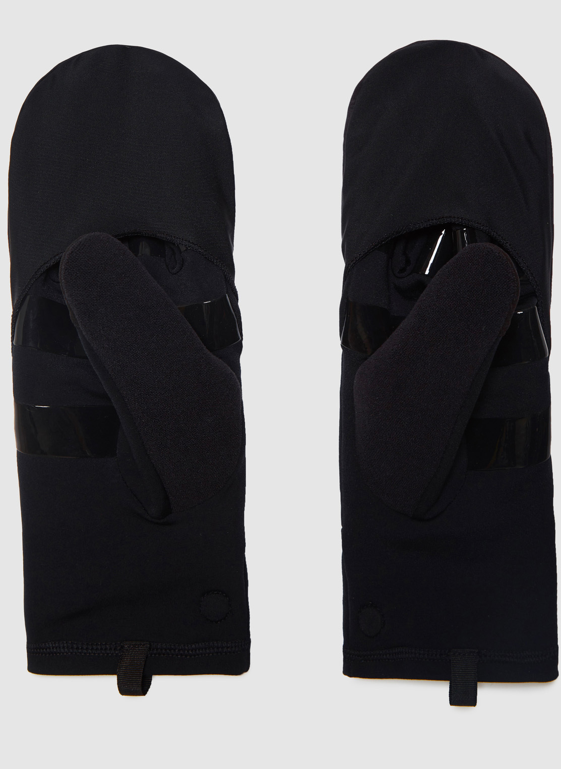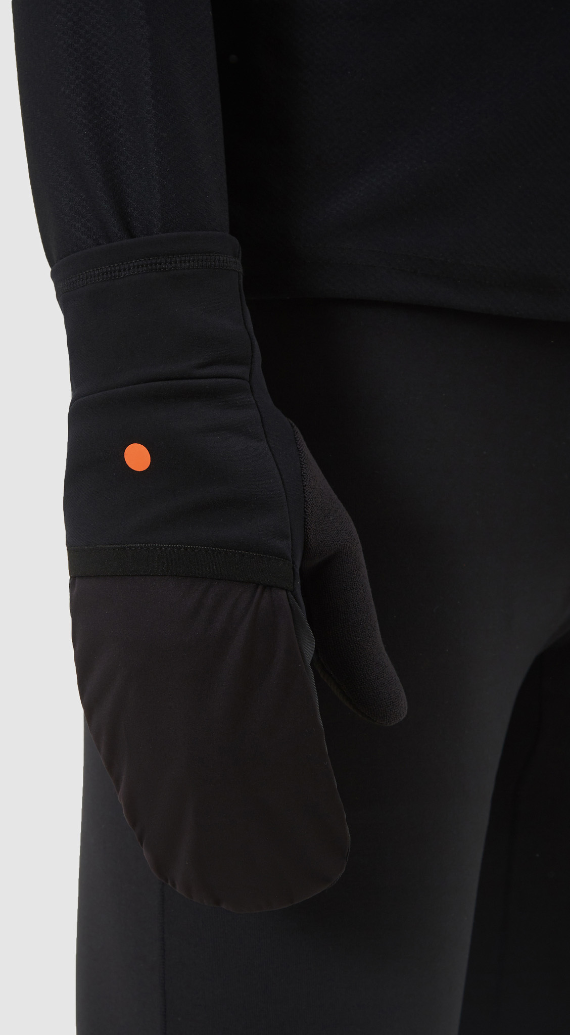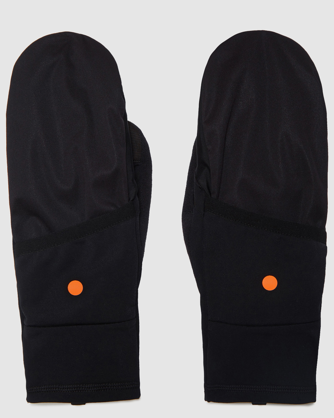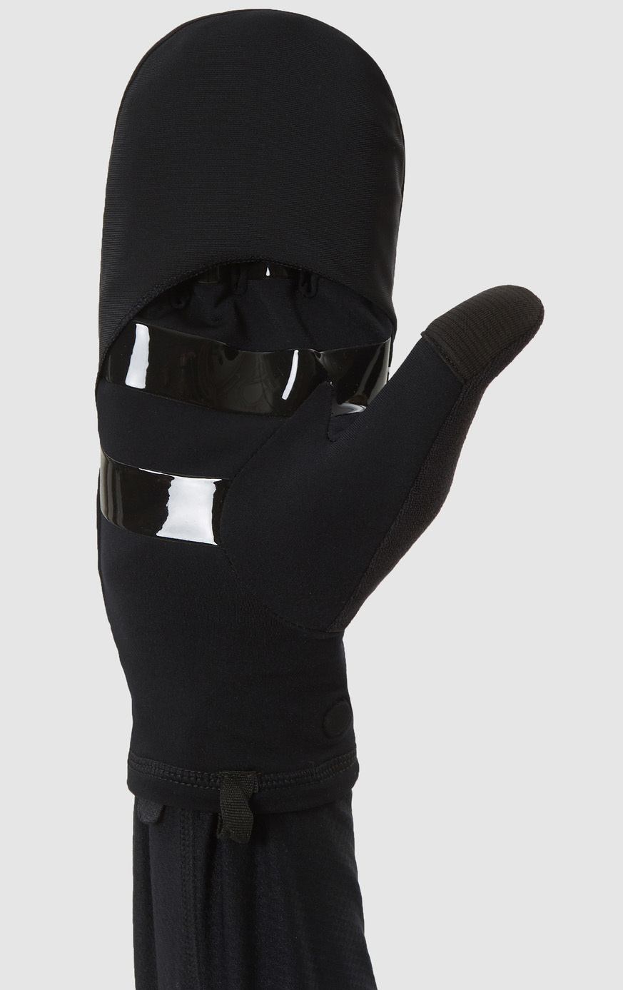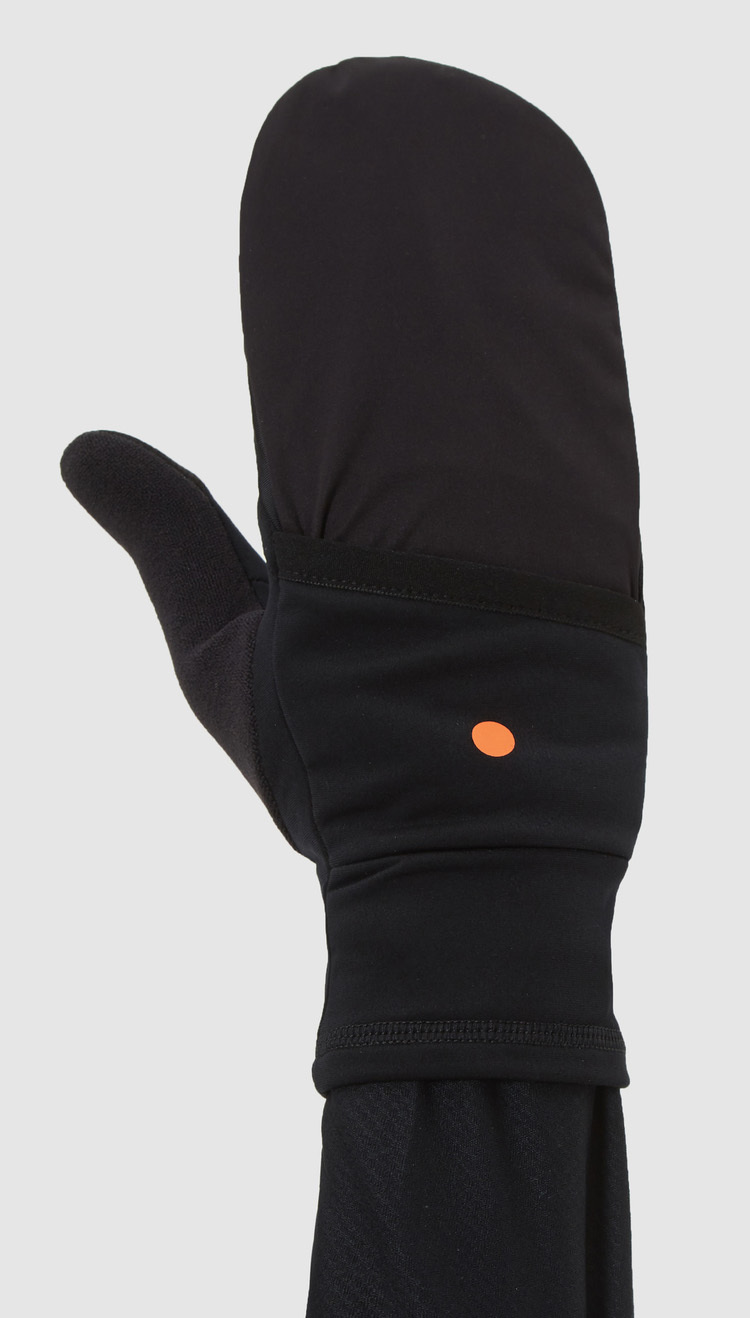 Снаружи есть ветрозащитная накладка, позволяющая трансформировать перчатку в варежку. Когда вы интенсивно тренируетесь на +5..-10°С используйте их просто как удобные лёгкие перчатки, а когда холоднее -10°С, надевайте ветрозащитную варежку сверху.