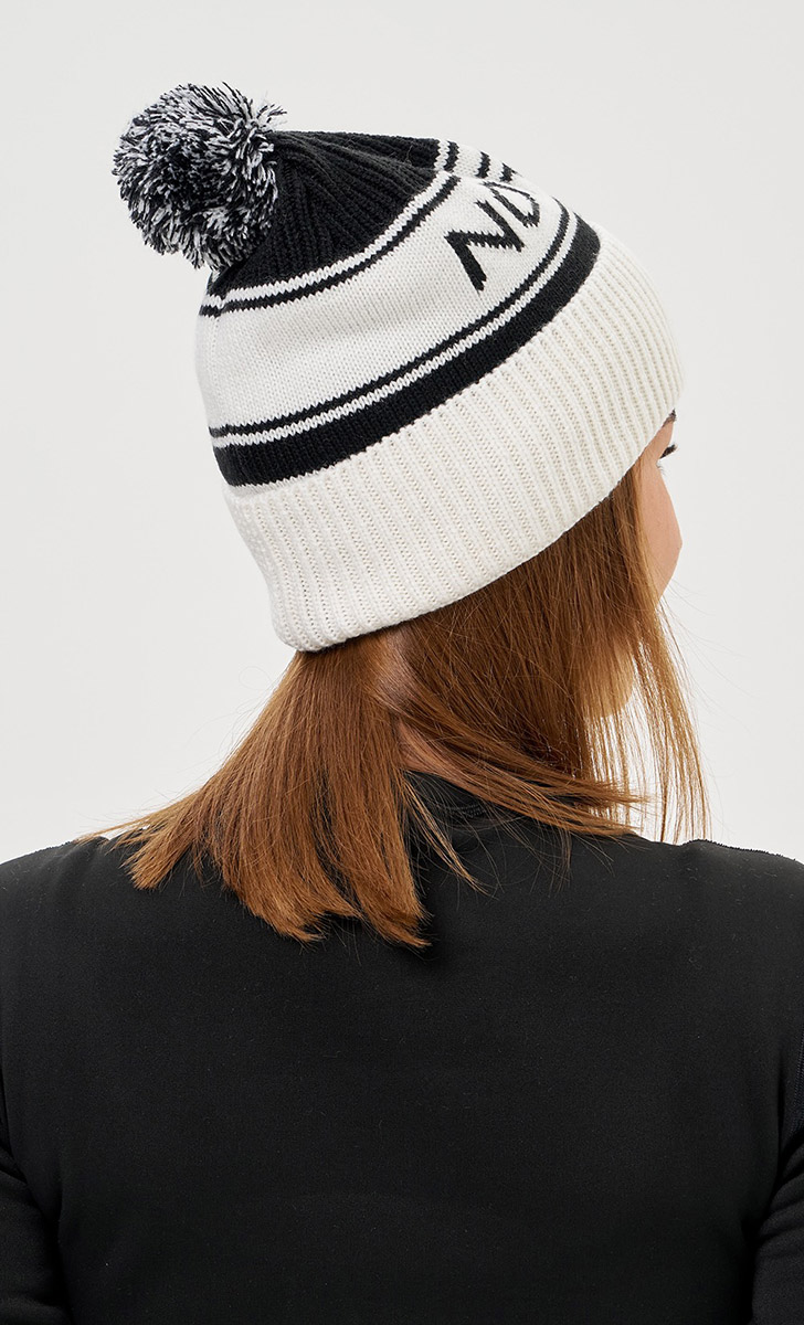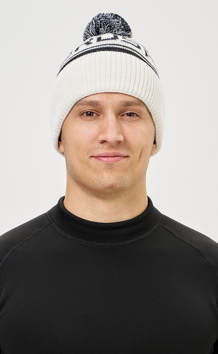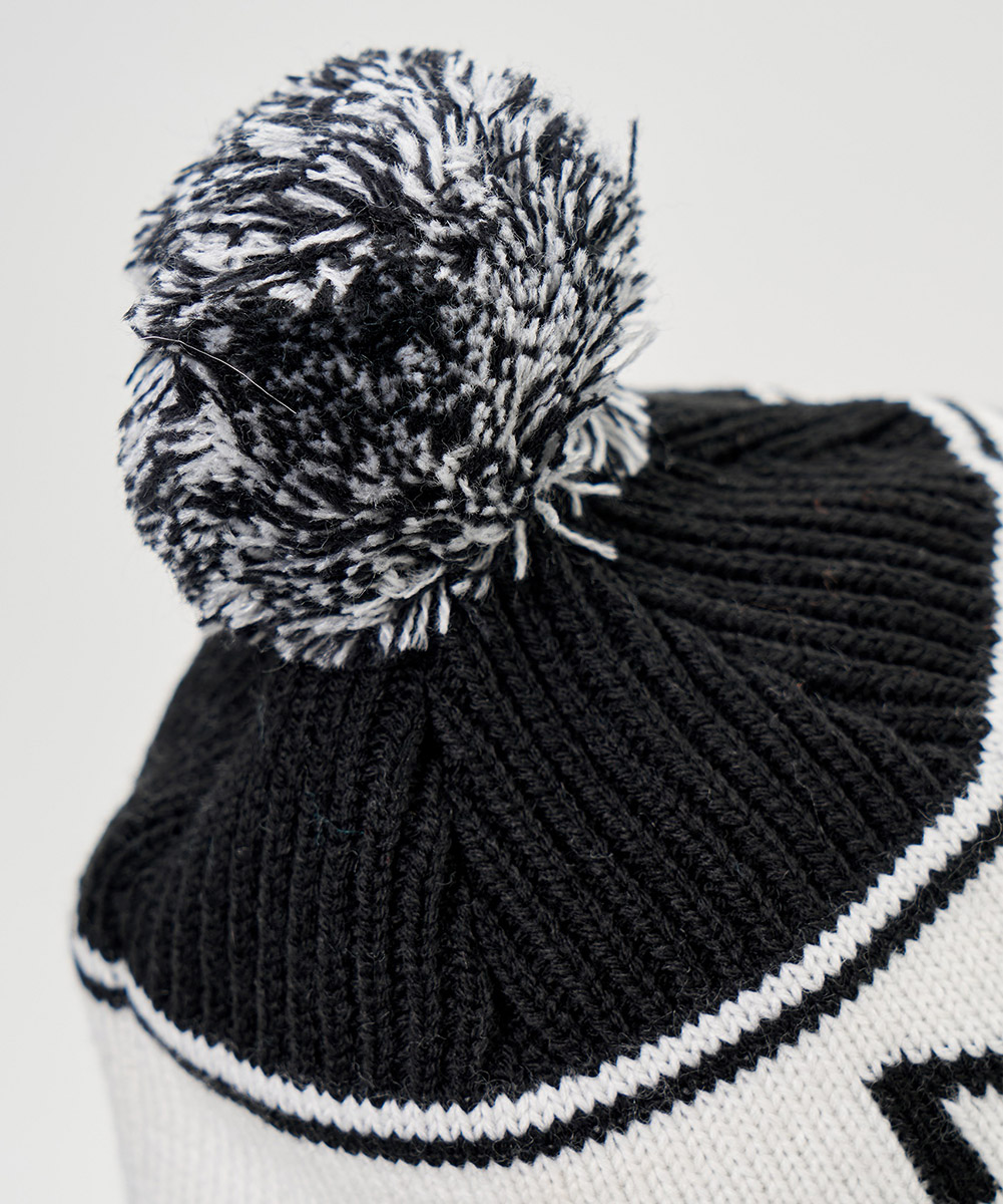Шапка имеет стандартную посадку, благодаря чему хорошо садится на голову и не вызывает дискомфорта при длительном использовании. Дизайн модели подчёркивают стильный помпон и крупный вывязанный логотип, добавляющие изделию узнаваемости и выразительности.