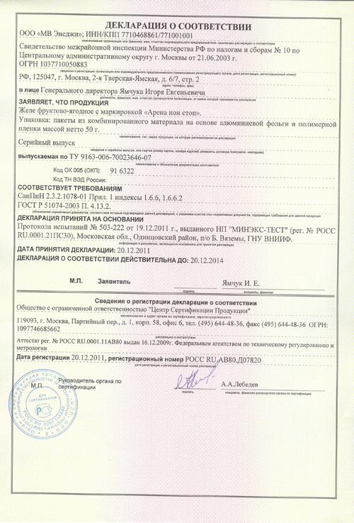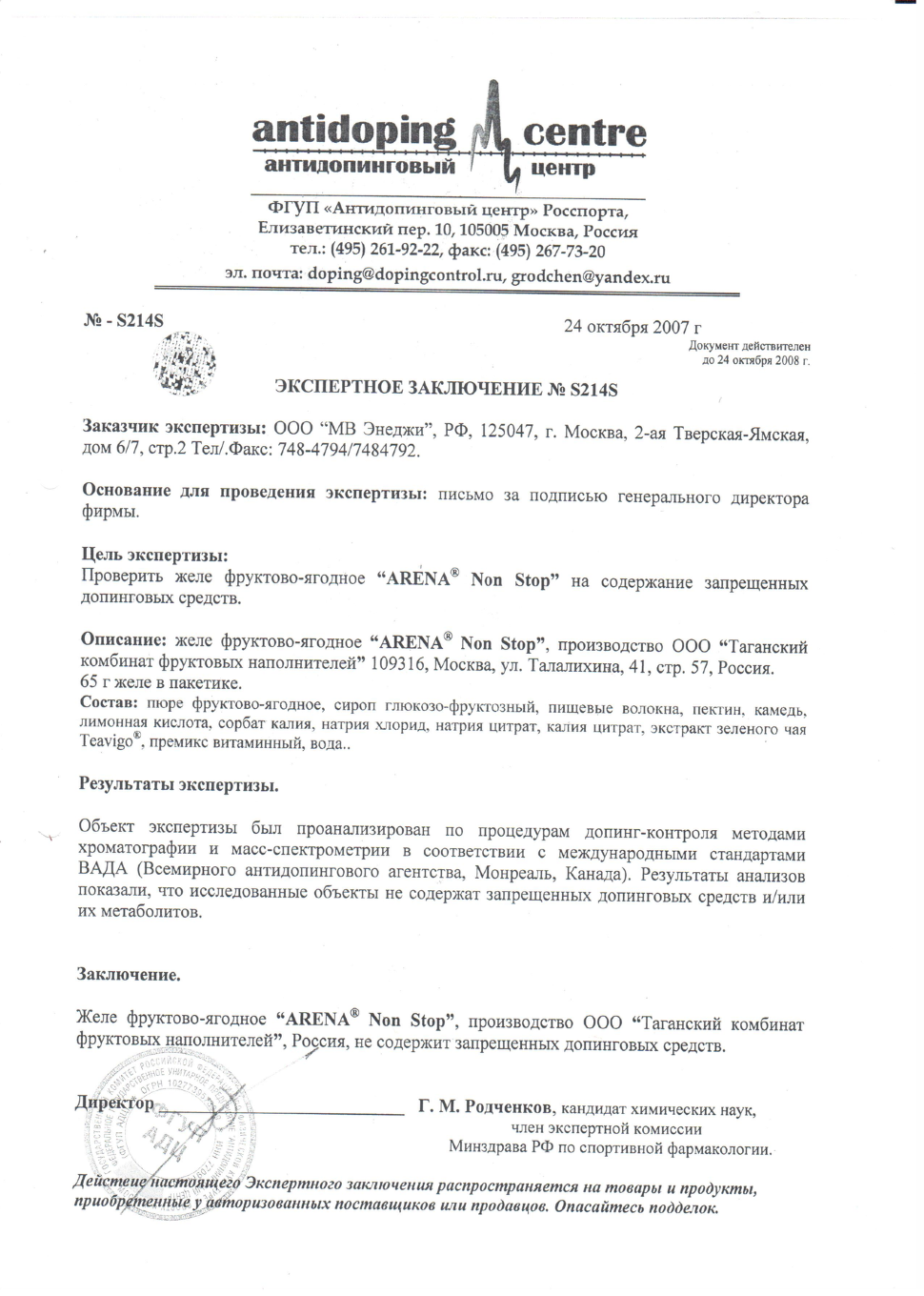Важная информация для спортсменов: «Арена» Первая имеет сертификат соответствия № РОСС RU.АЮ97. В35065, а также санитарно-эпидемиологическое заключение № 77.МО.01.916.П.002455.11.07 и экспертное заключение № S214S антидопингового центра Росспорта об отсутствии в составе запрещенных допинговых средств.